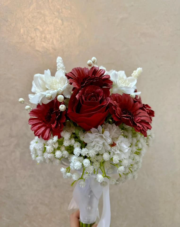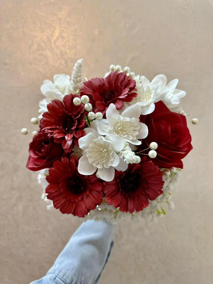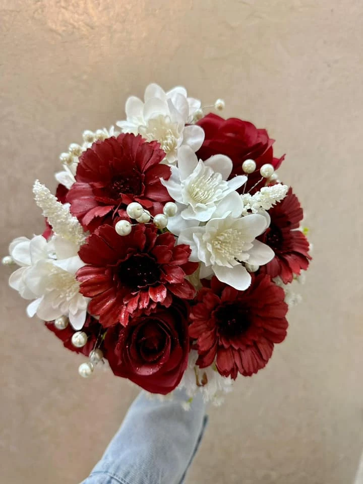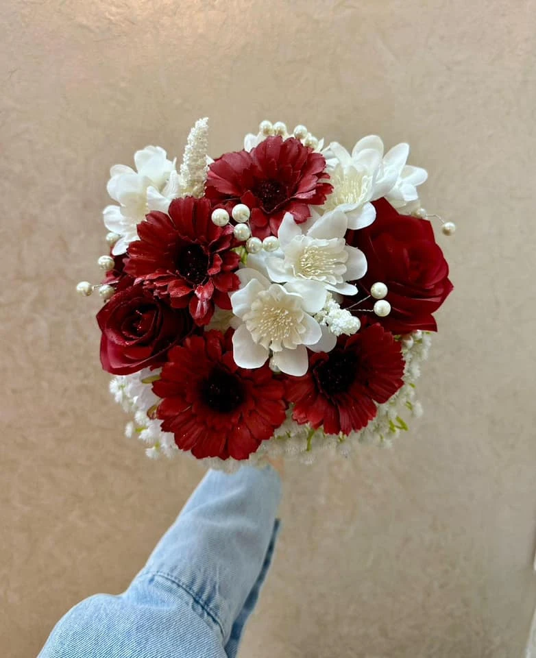 مسكة ورد صناعي أنيقة مكوّنة من ورد الجوري الأحمر، زهور الجيربيرا، وزهور بيضاء ناعمة مع حشوة دقيقة ولمسات لؤلؤ. تنسيق فاخر يناسب الأعراس، الخطوبة، الهدايا والتصوير، مع مسكة مزيّنة بشريط أنيق.