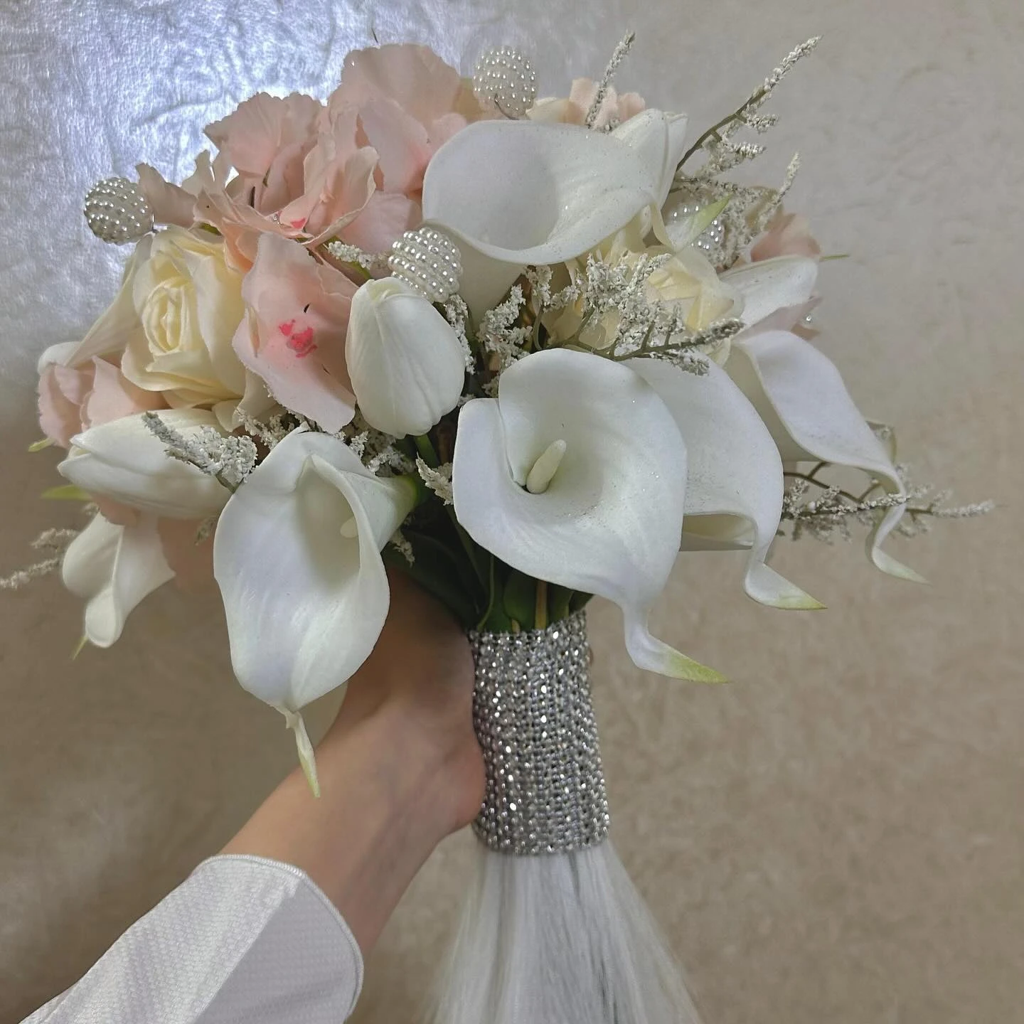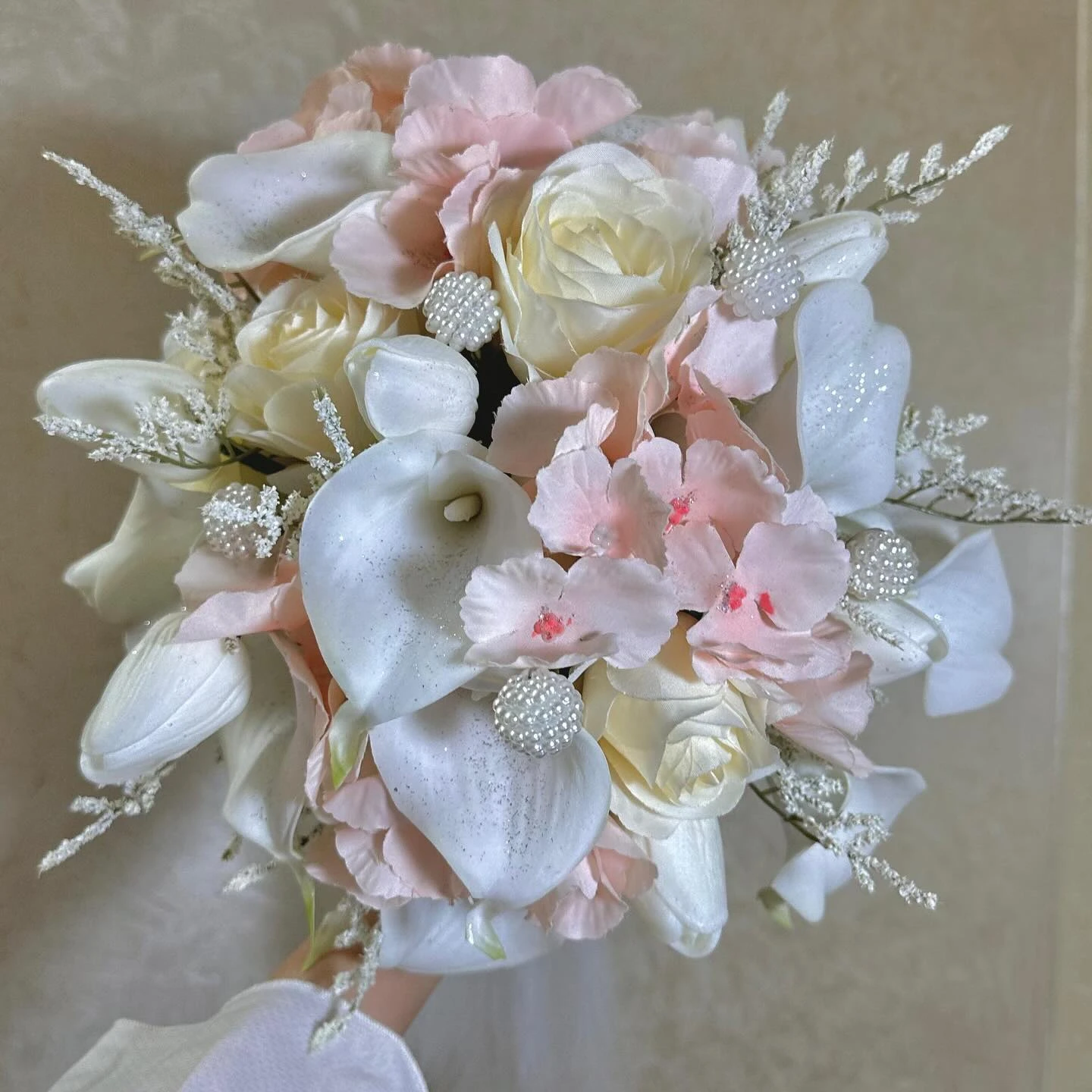مع لمسات وردية ناعمة وورد جوري أوف وايت، مزينة بحبات لولو أنيقة.