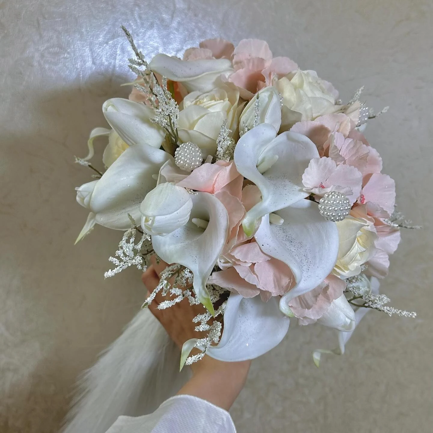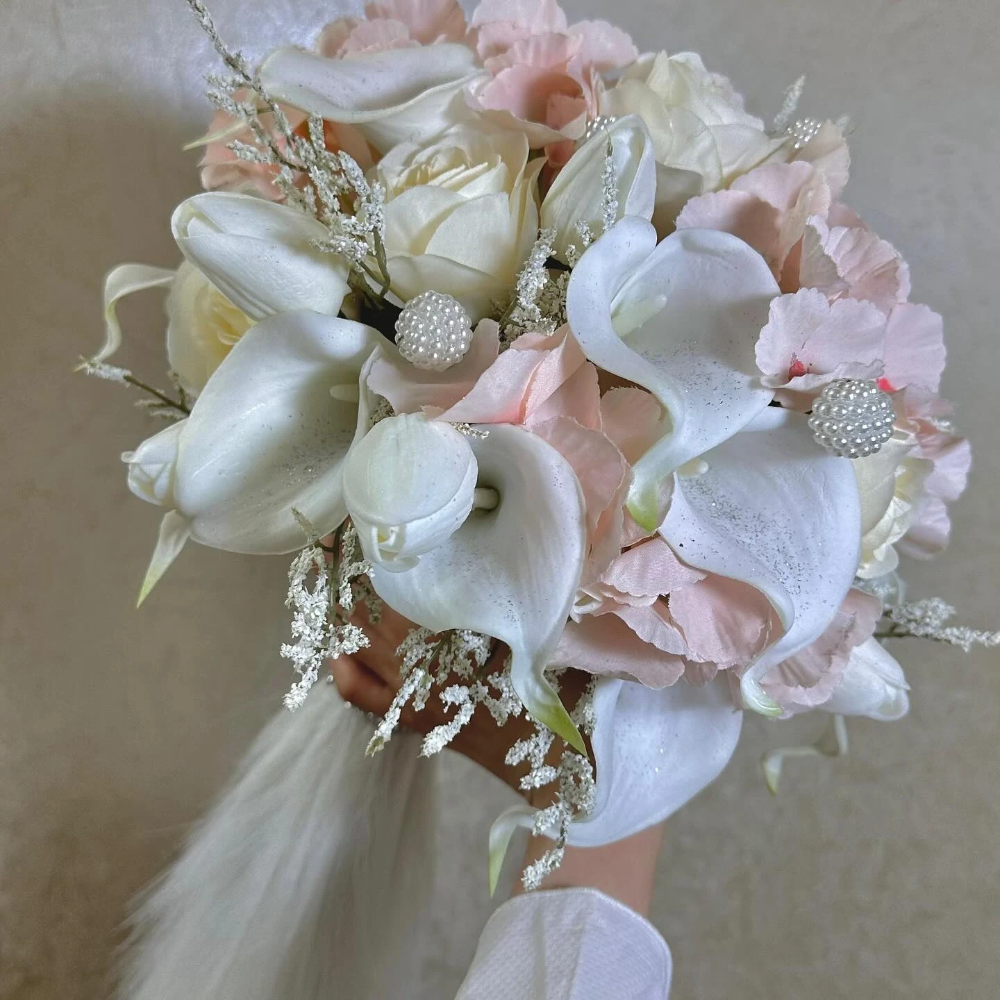 مع لمسات وردية ناعمة وورد جوري أوف وايت، مزينة بحبات لولو أنيقة.